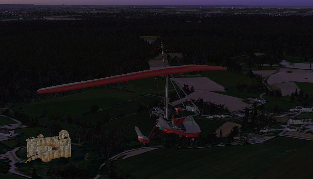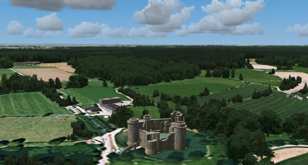 - les trois châteaux suivants : l'Hermitage-Lorge, Rochers-Sévigné, la Touche Trébry. Ces trois objets sont issus de la librairie Sketchup-Google. Un grand merci à Tidy auteur de ces trois châteaux. De mon côté, j'ai porté ces bâtiments sur FSX en LOD13 (Nextmesh indispensable) en les optimisant au maximum (nombre restreint de polygones et textures allégées) pour conserver une bonne jouabilité sur une base de Bretagne 3DA de France VFR.