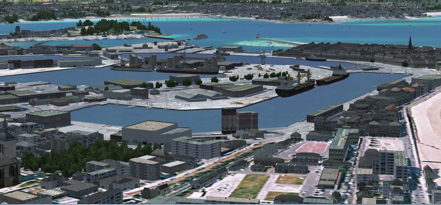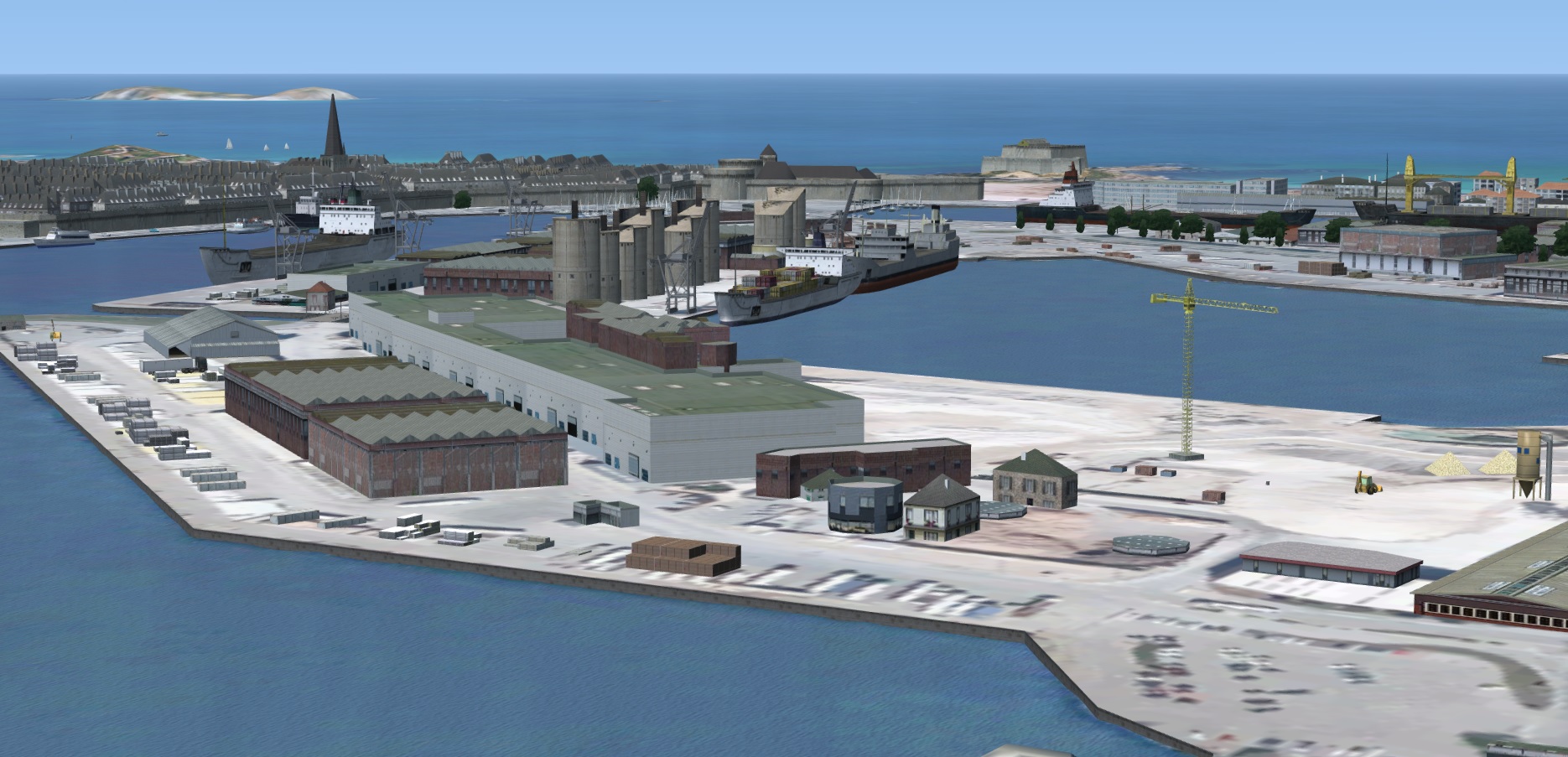 - A partir de la scène Bretagne Volume 1 3DA de France VFR, il a reconstruit (avec Instant Object Studio) tous les quais en 3D avec textures photos,