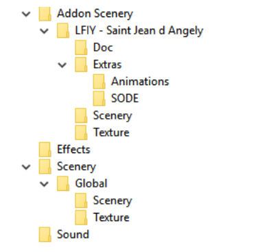 Décompressez l’archive Zip dans votre répertoire FSX.Le répertoire de la scène LFIY – Saint Jean d Angely sera créé et les différents fichiers seront placés à l’emplacement adéquat :
