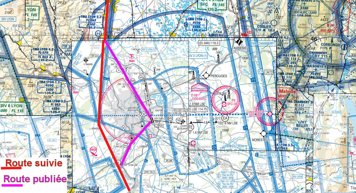 Transit Ouest de Lyon, comme à l'aller, on se fait bien secouer quelques minutes entre les contre-forts du Mont Pila et du Mont Verdun. Avec le recul, je pense qu'avec un vent du sud, vaut mieux s'écarter des reliefs du Massif Central, et carrément prendre le transit centre par les points VFR publiés (route publiée en rose ci dessous) :